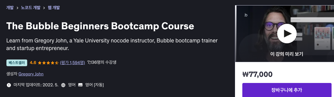 Bubble을 처음 접하는 분들에게 가장 추천하는 강의는 바로 Udemy의 ‘The Bubble Beginners Bootcamp Course’ (Gregory John 강사) 입니다.