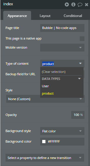 Bubble의 Page 요소에 Type of Content를 설정하면, Bubble은 자동으로 Path에 있는 Slug 또는 Unique ID를 사용하여 해당 페이지의 Type of Content를 설정합니다